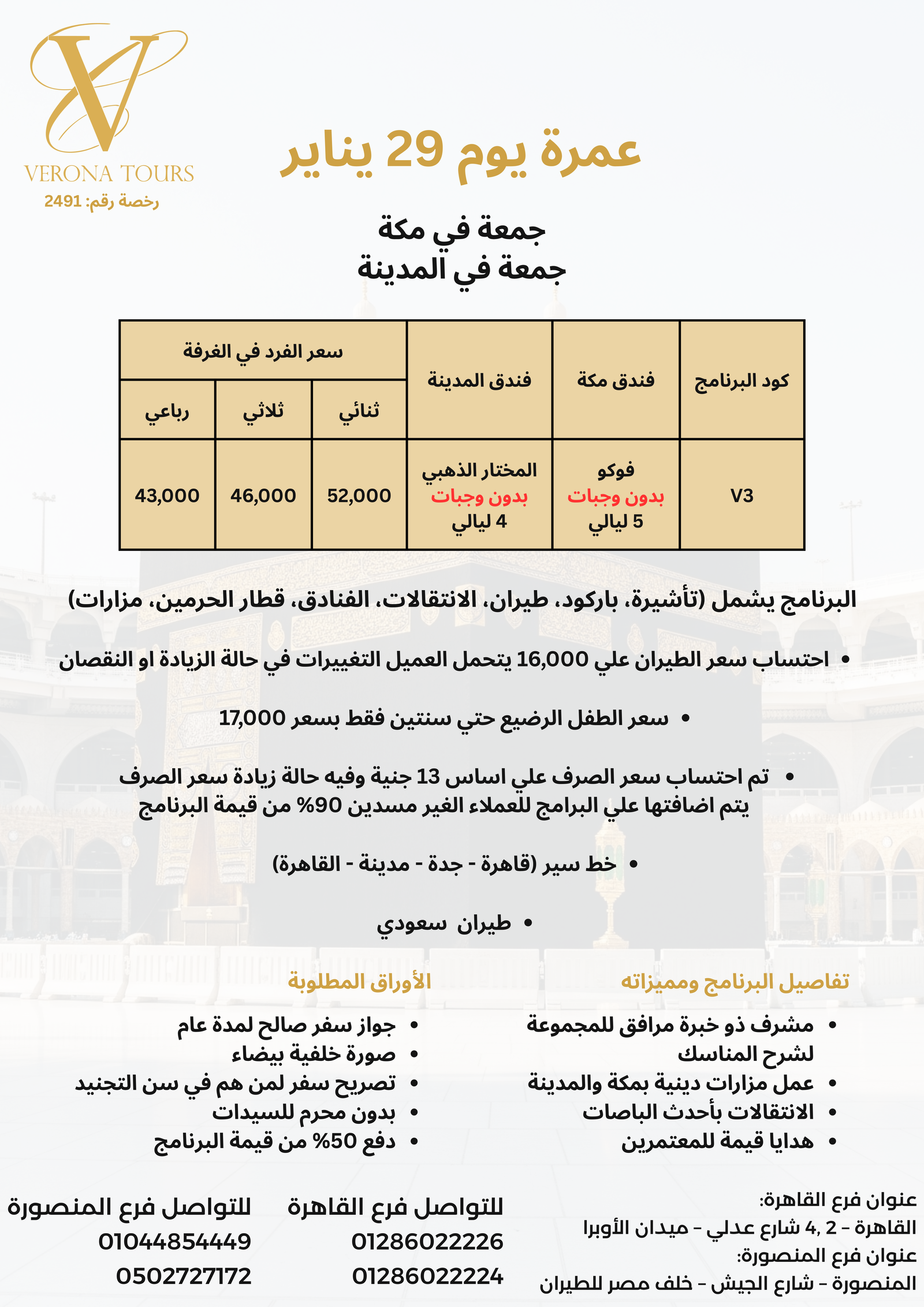 عمرة 29 يناير (أسبوع في رحاب الحرمين) - برنامج V2 الاقتصادي نطاق السعر: من ⁦34,999 EGP⁩ خلال ⁦39,999 EGP⁩