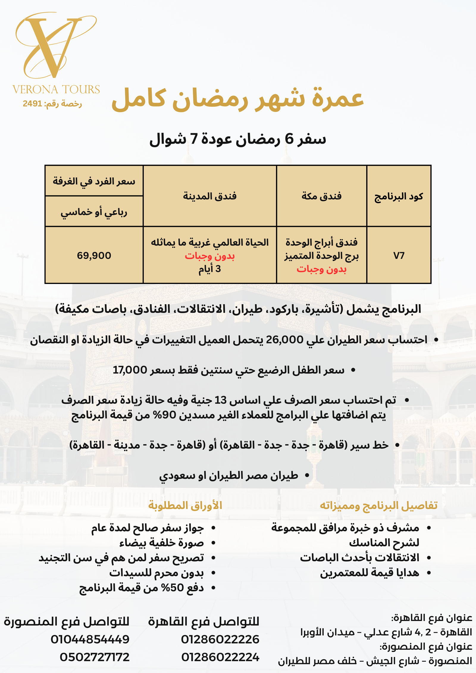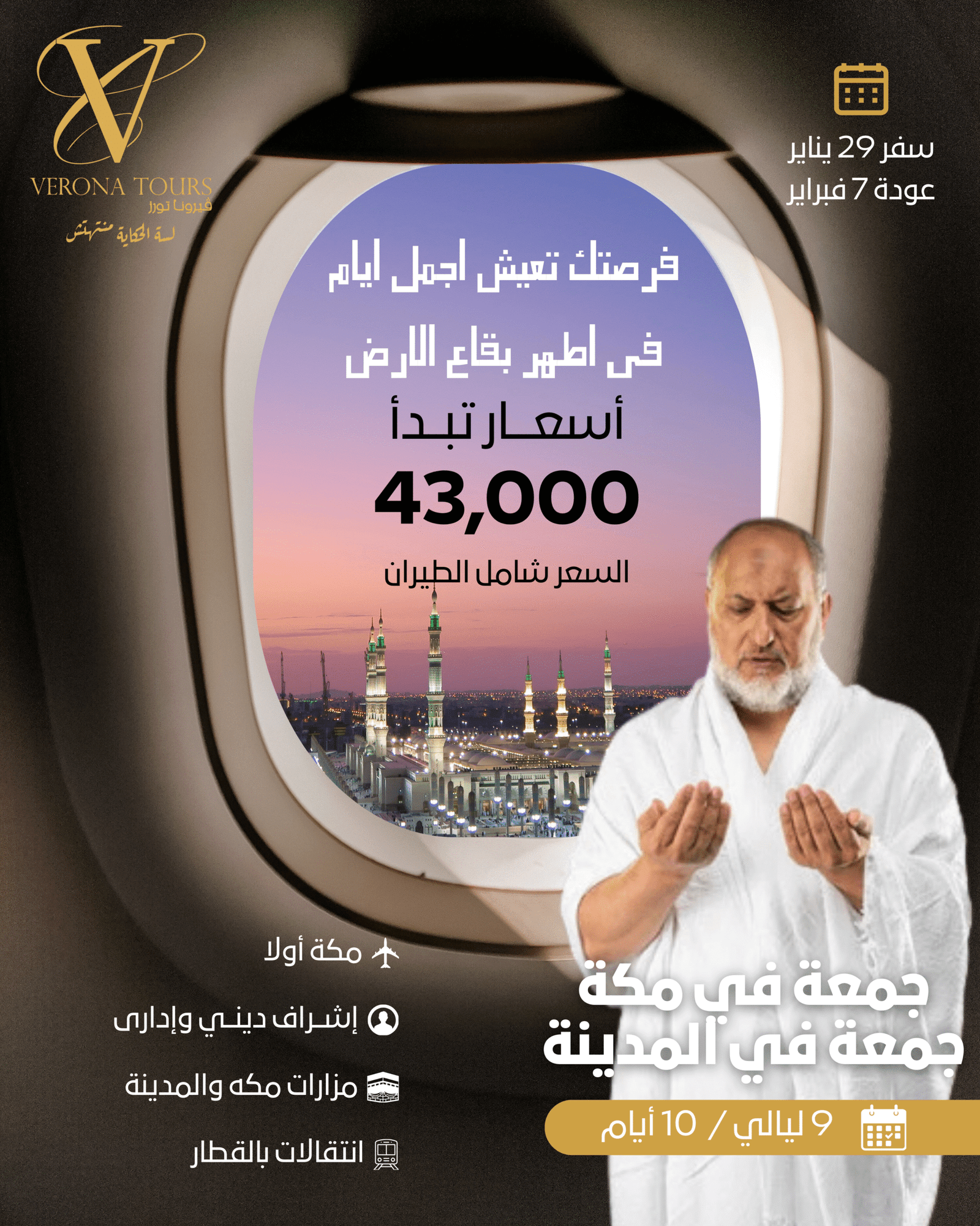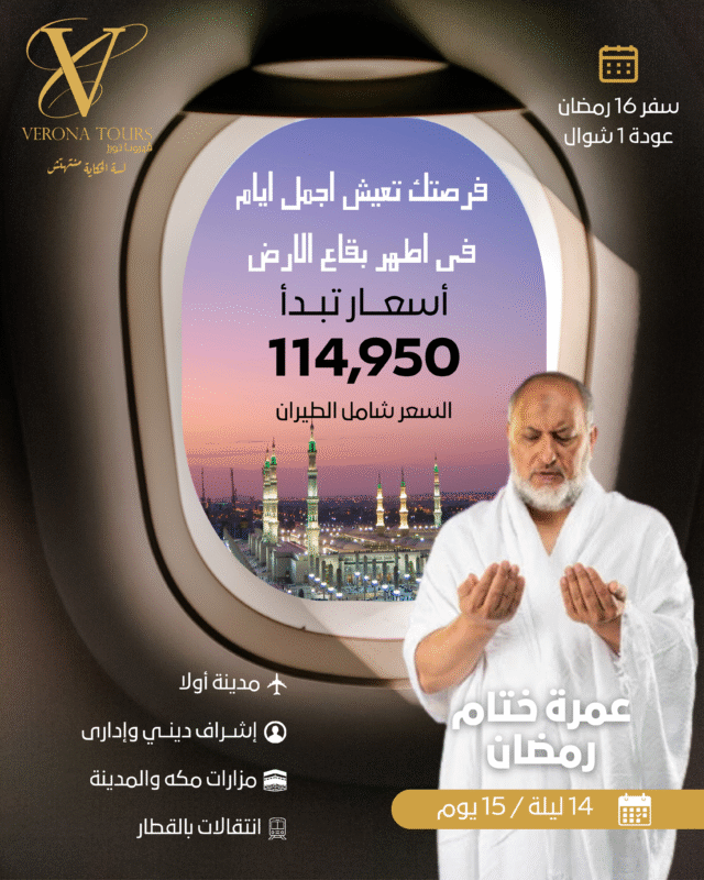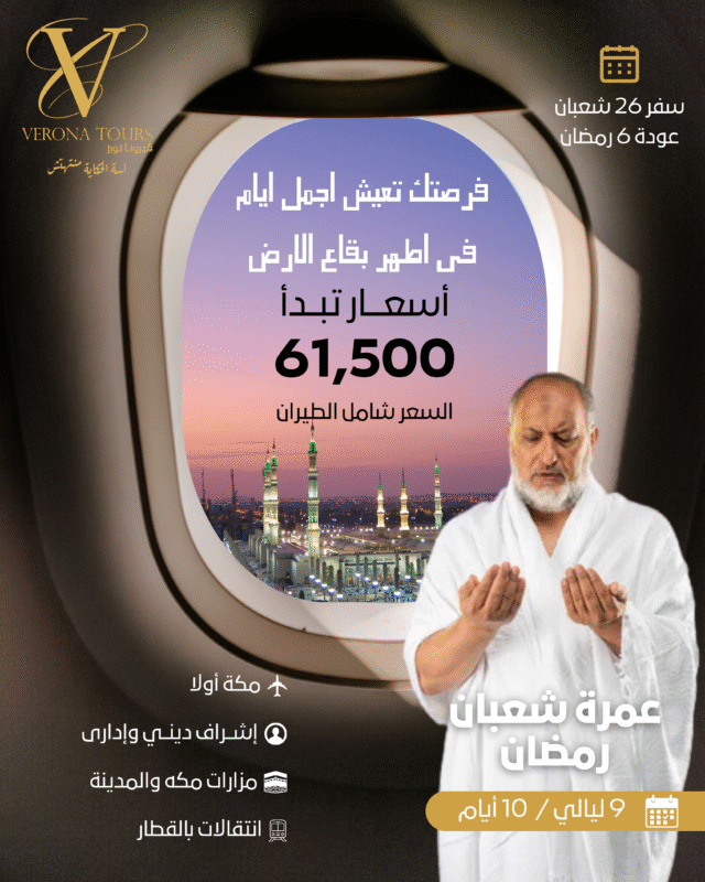 🗓️ موعد الرحلة: السفر 6 رمضان – العودة 19 رمضان. ✈️ الطيران: مصر للطيران أو الخطوط السعودية. 📍 خط السير: (قاهرة – مدينة – جدة – قاهرة) – بداية بالمدينة المنورة.